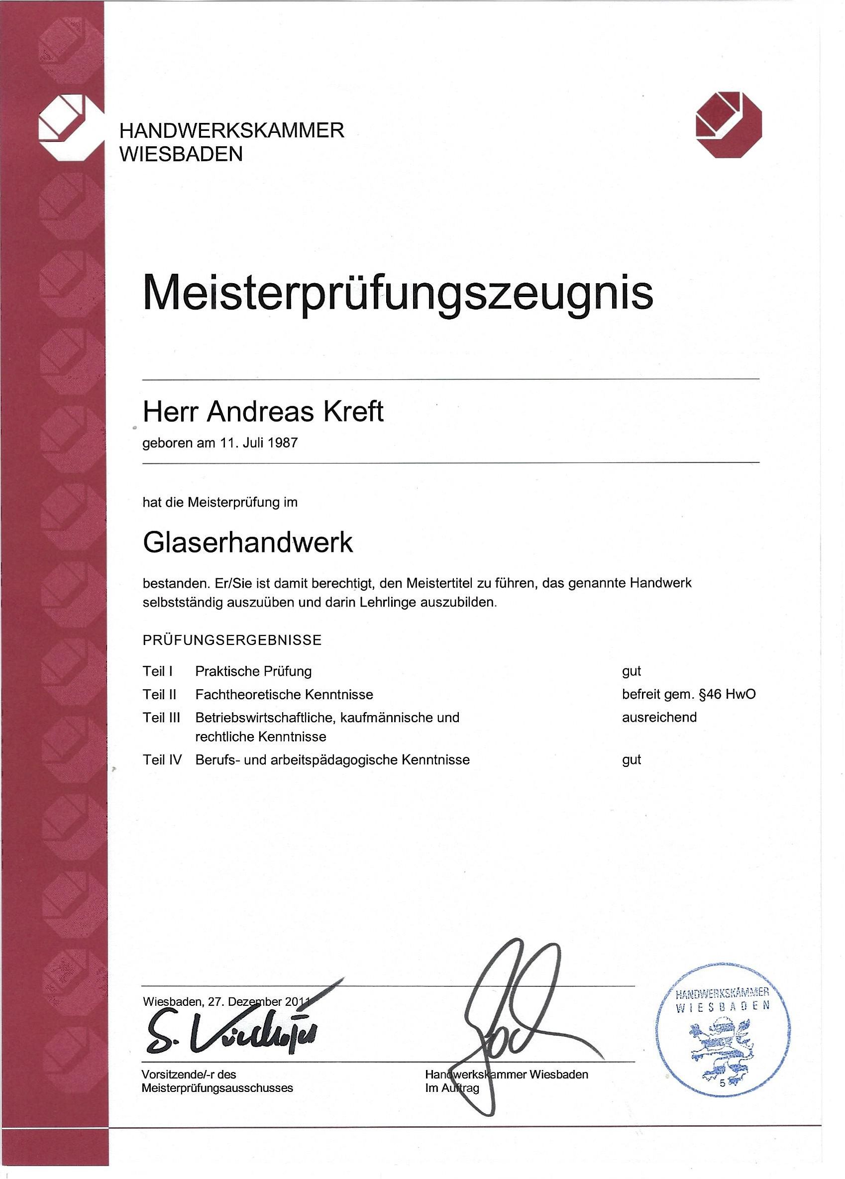 - 2011 – Ernennung zum Meister des Glaserhandwerks