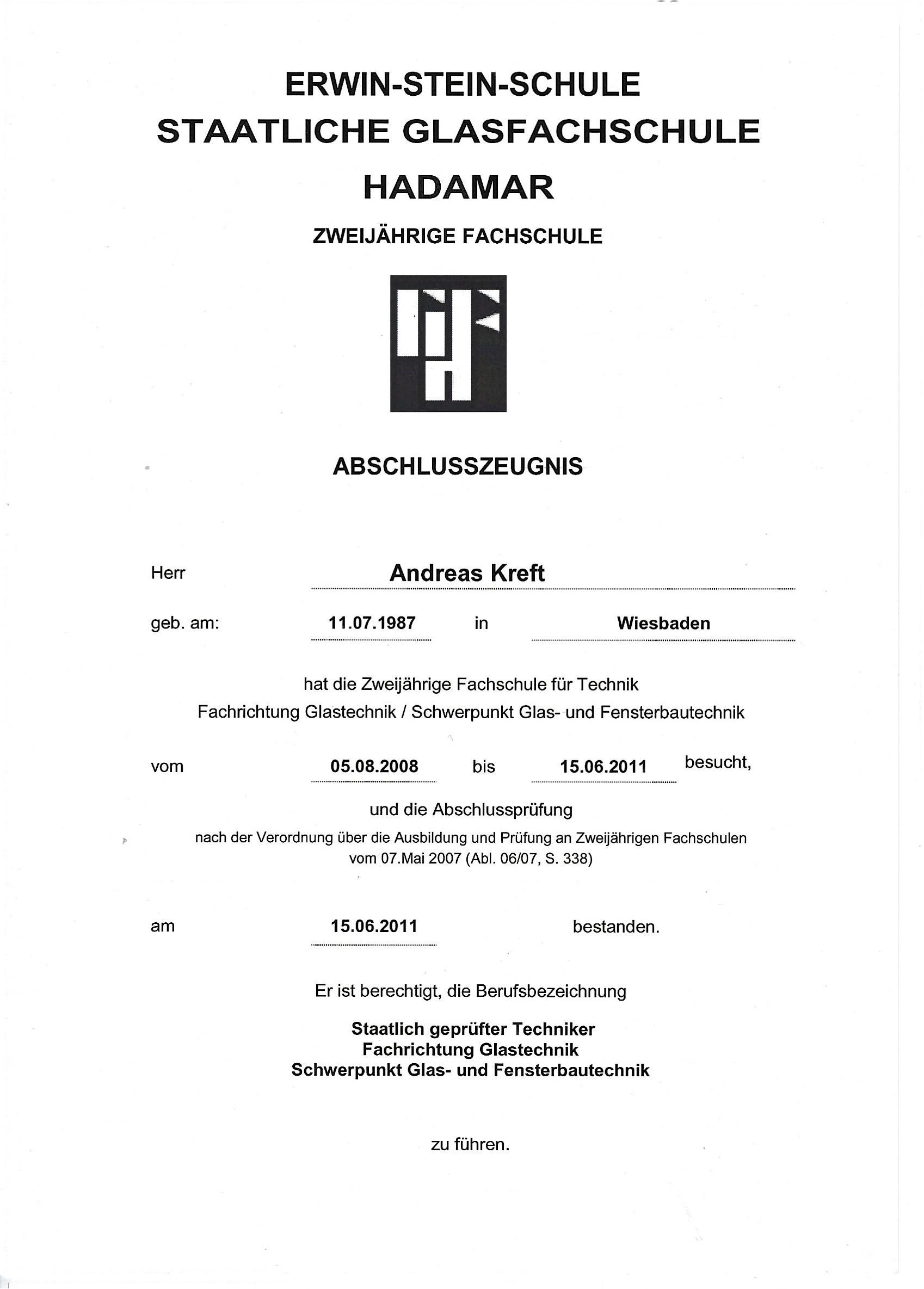 - 2011 – Abschluss als staatlich geprüfter Techniker (Fachrichtung Glastechnik, Schwerpunkt Glas- und Fensterbautechnik)